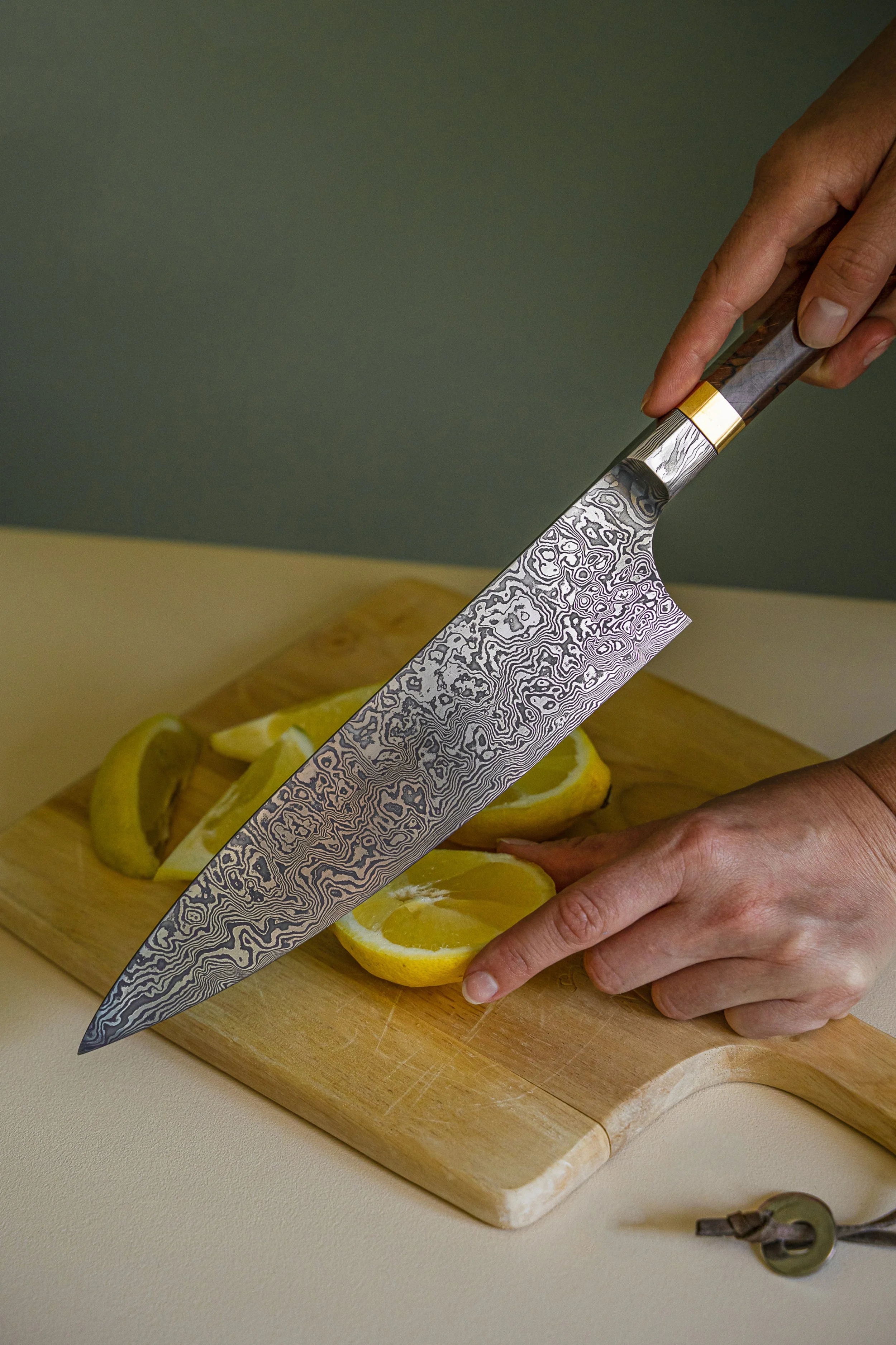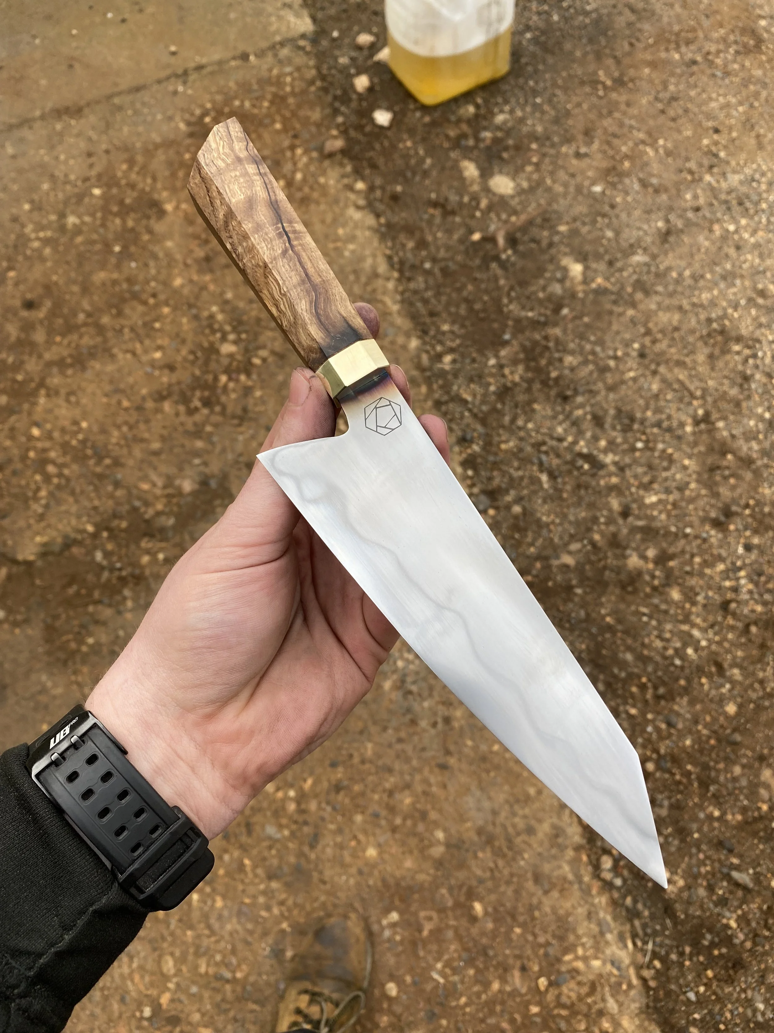 Integral Bolster Chef's knife, Housemade Damascus, solid Brass, Desert Ironwood